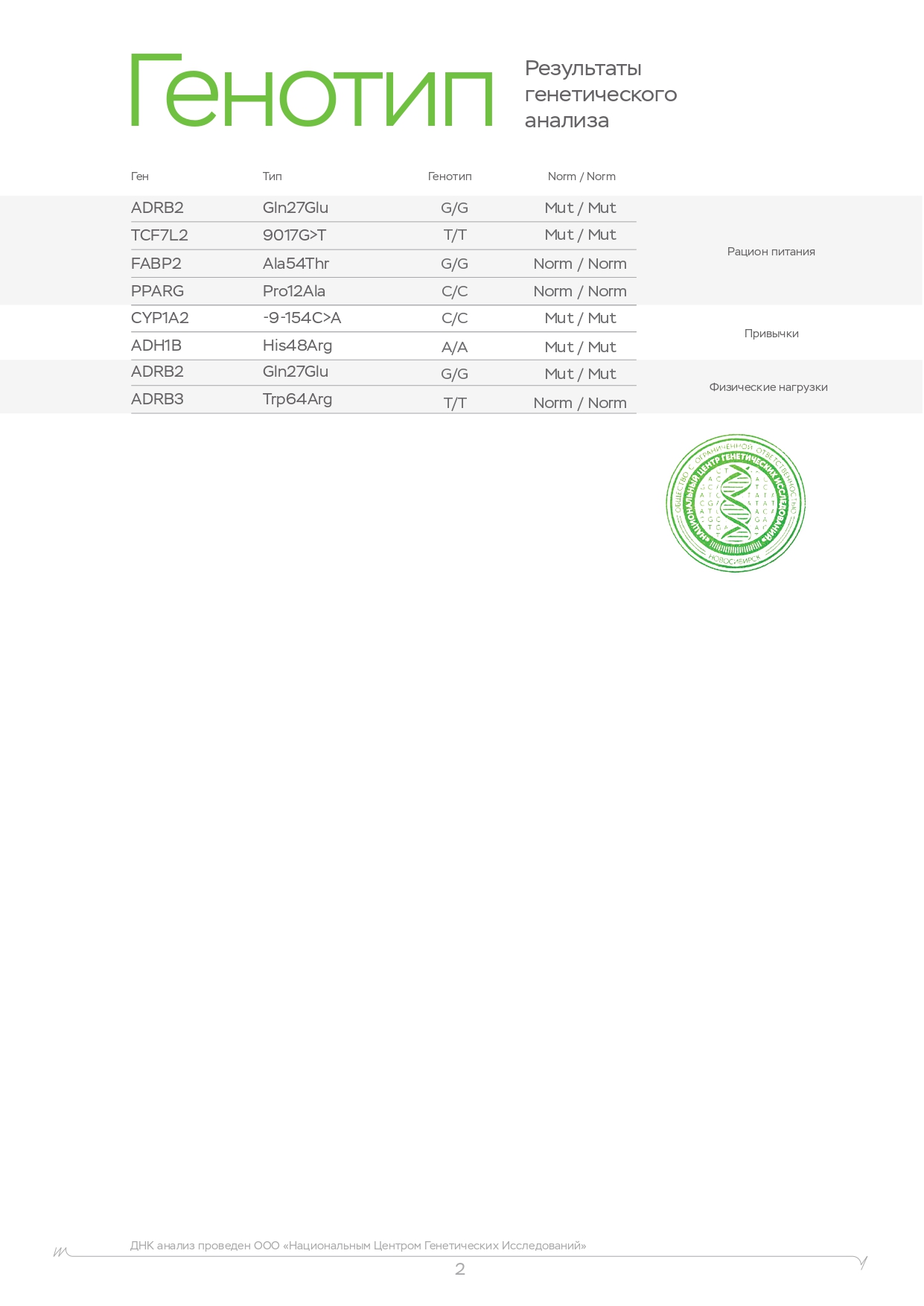 Этот ДНК анализ показывает, к каким физическим нагрузкам человек расположен генетически, а также какие продукты (содержащие определенные элементы) лучше употреблять в пищу. У каждого человека свои цели, кто-то хочет просто сбросить лишний вес, кто-то увеличить силу мышц, а кто-то нарастить огромные мускулы. Для получения максимальной отдачи от тренировок мы рекомендуем пройти наш генетический тест для фитнеса в Ленинске.